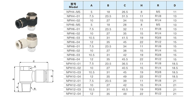 快插式气动接头系列选型尺寸图