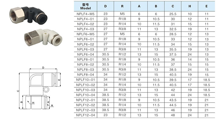 快插式气动接头系列选型尺寸图